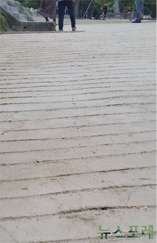 불교미술관 옆 경사로가 황토시멘트로 부실하게 포장된 현장. <뉴스포레 사진>