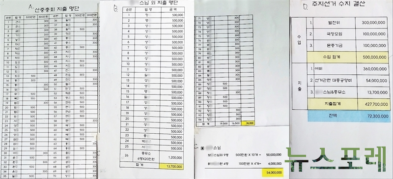 본지가 입수한 지난해 불국사 주지 부정선거 혐의 근거 자료 중 'A' 'B' 'C' 문서의 지출 내역이 'D 주지선거 수지 결산'에 요약돼 있다. <뉴스포레 사진>