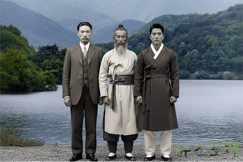 동대해연이 AI로 복원해 공개한 해월 선생 삼부자의 사진. 왼쪽이 장남 최동호.<사진 제공= 동대해연>